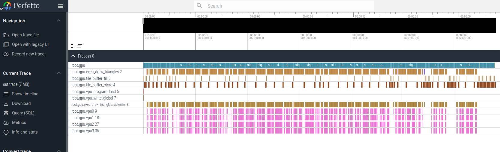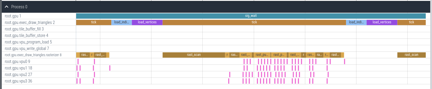 As an example, here's a trace of a single frame. You can see on the left side a set of processes including the functional units for the GPU, the triangle draw coordination logic, tile buffer fill unit, file buffer store-to-SDRAM unit, VPU program loader, rasterizer, etc. At the bottom, you see 4 tracks, each corresponding to work happening on VPUs. Space is used to show idle functional units.